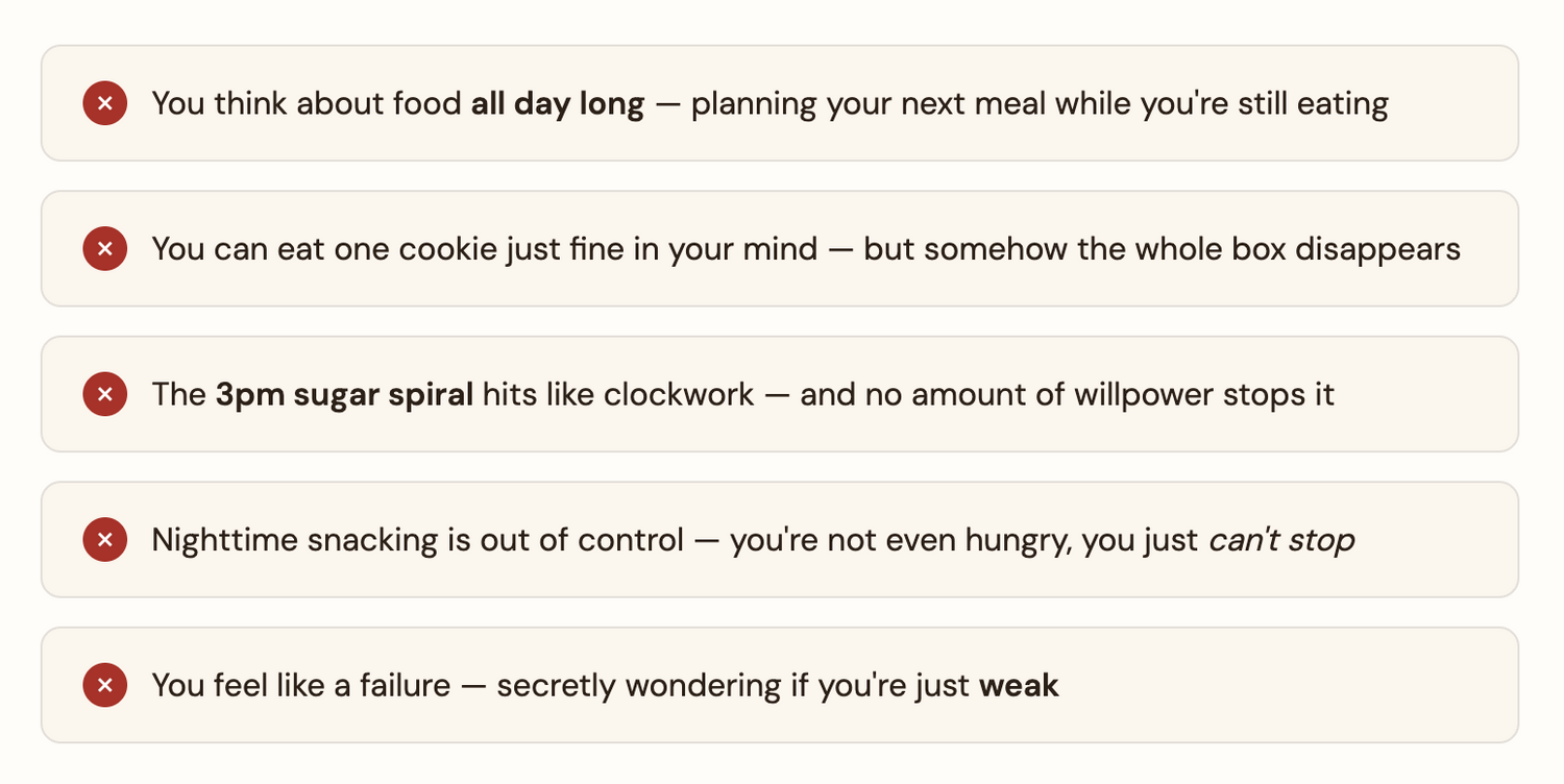 It's your cortisol and blood sugar silently driving every craving, every binge, every 3pm sugar spiral — and no amount of willpower fixes a hormonal problem.